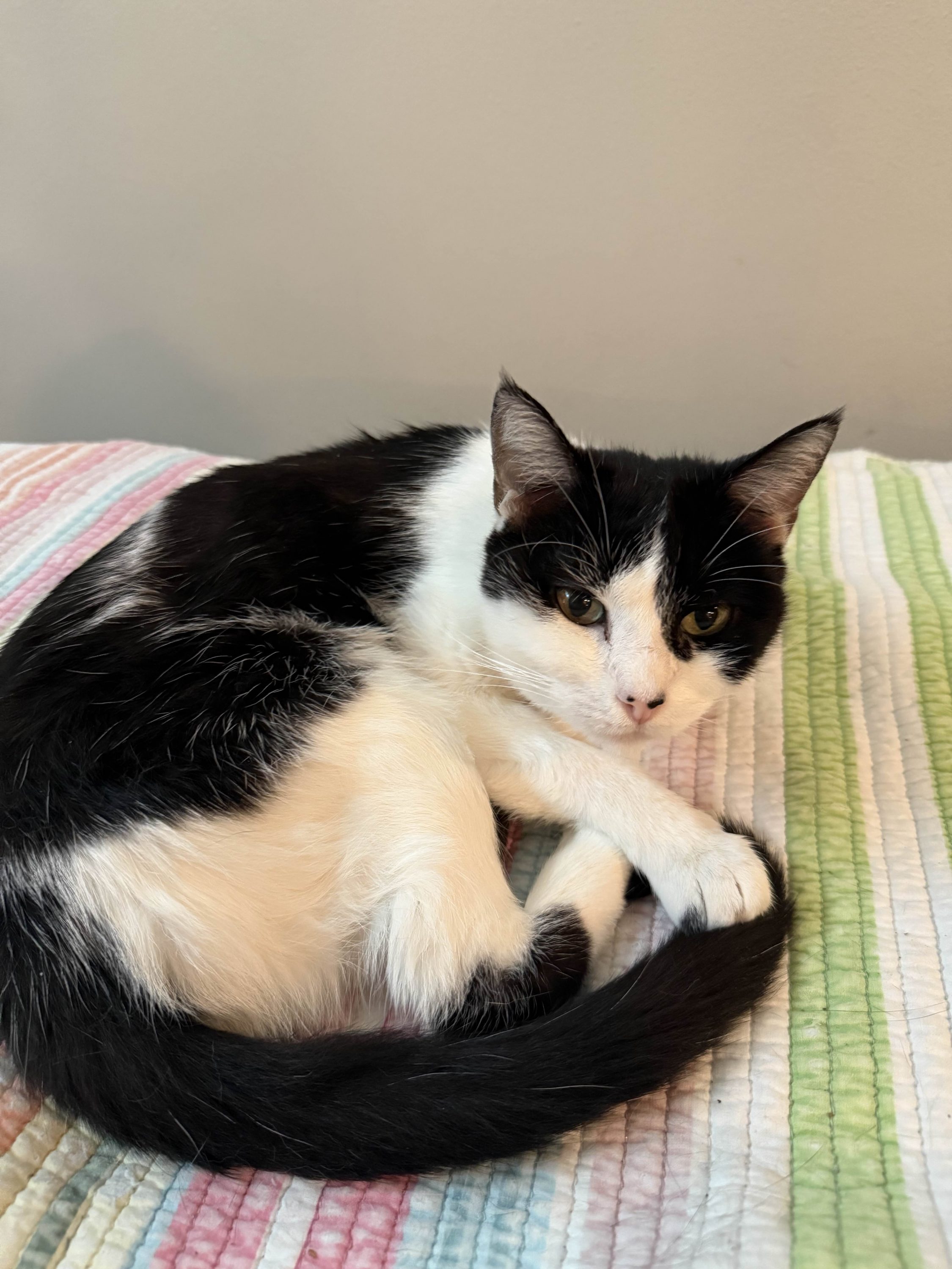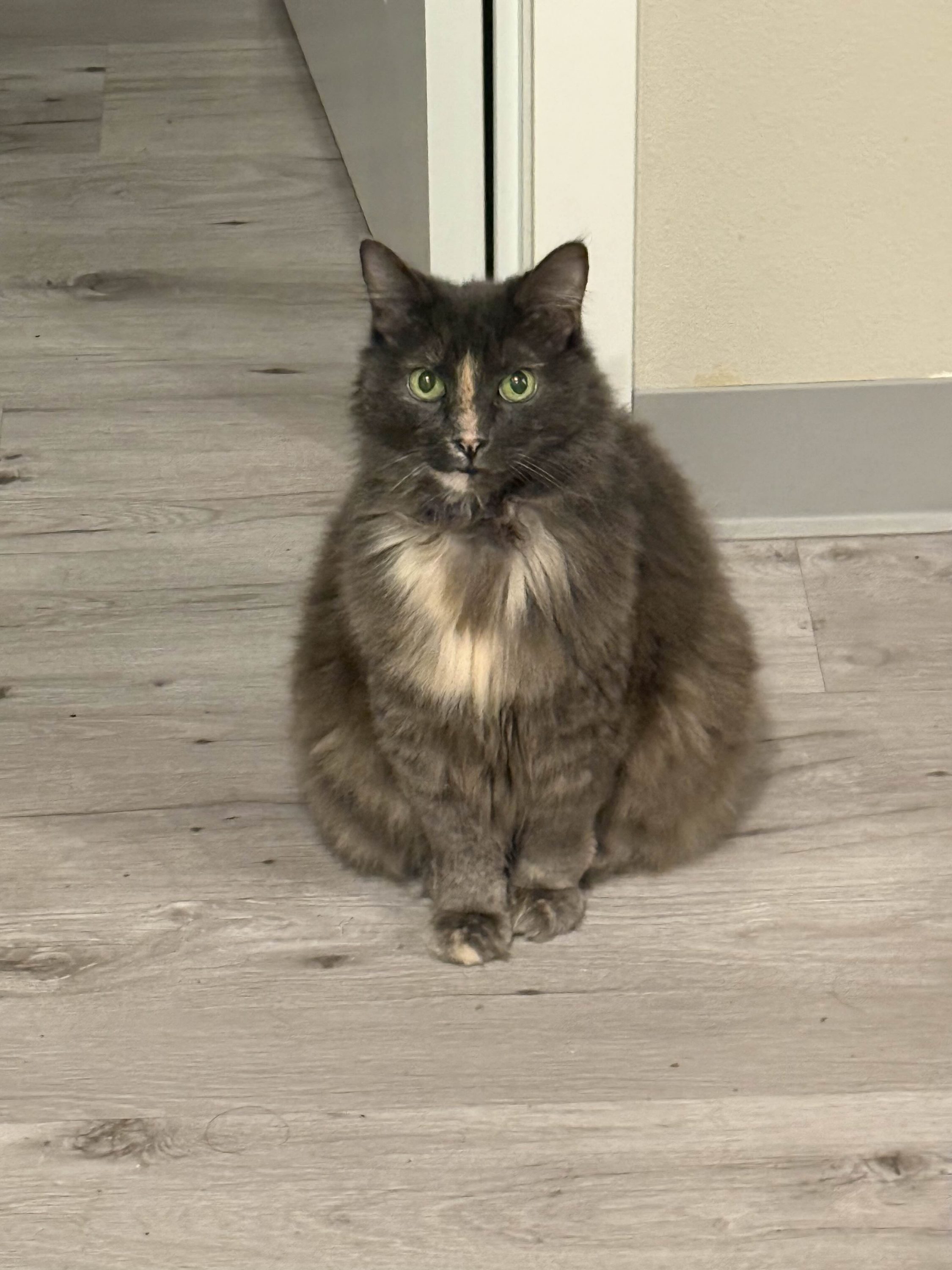 Nyan is a senior mixed race part gray Maine coon, a sassy ball of fluff with an attitude to match her intimidating shape.